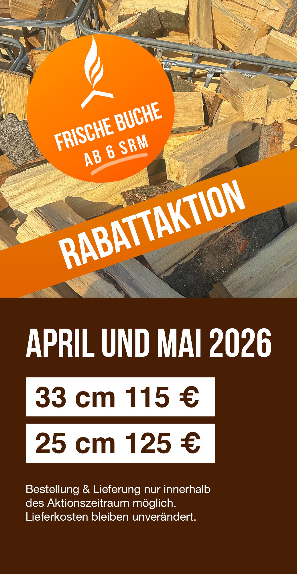 Es handelt sich um eine verbindliche Bestellung für frisches Buchenholz*. Wir melden uns bei Ihnen um die Bestellung und den genauen Liefertermin zu bestätigen!